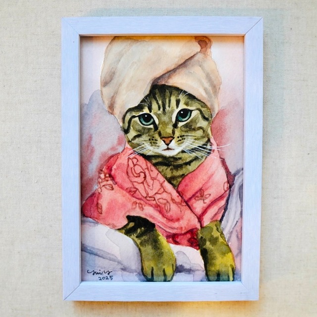 猫の水彩画(原画)です。 サイズ: ポストカードサイズ(10×14.8cm) ※自己裁断のため、サイズに多少誤差があるかもしれません。 ※紙に多少の歪みがある場合があります。 ※フレーム付きのものは簡易的なフレームです。販売価格は絵のみの金額になっています。
