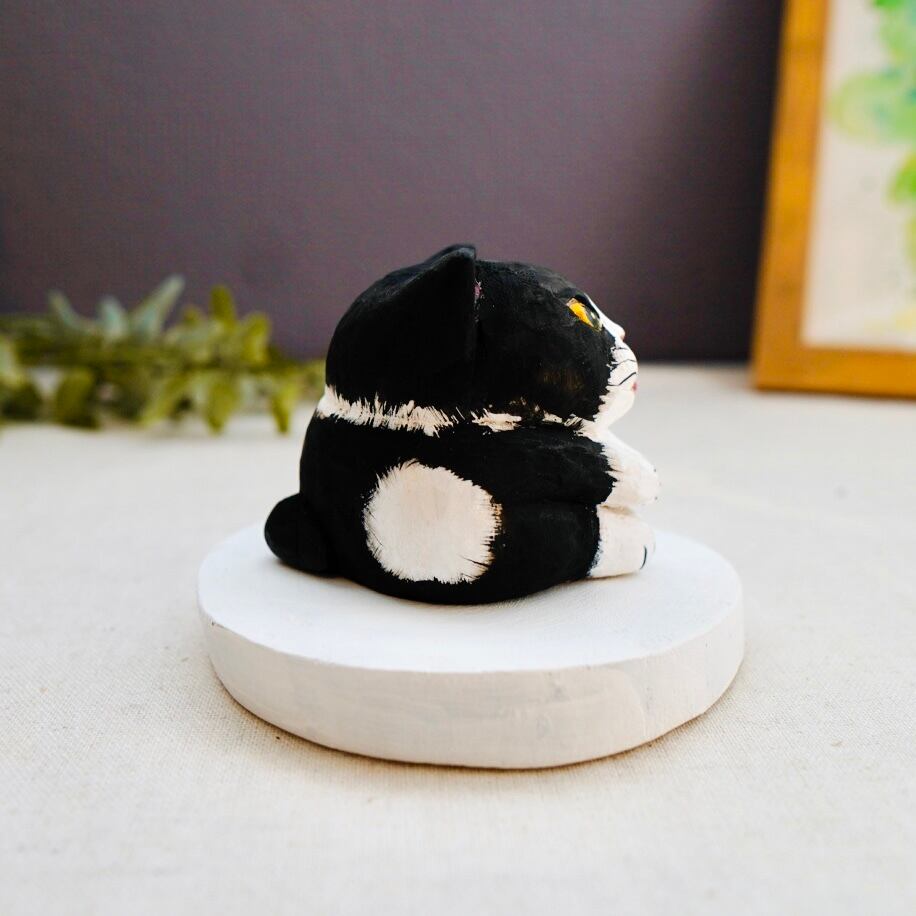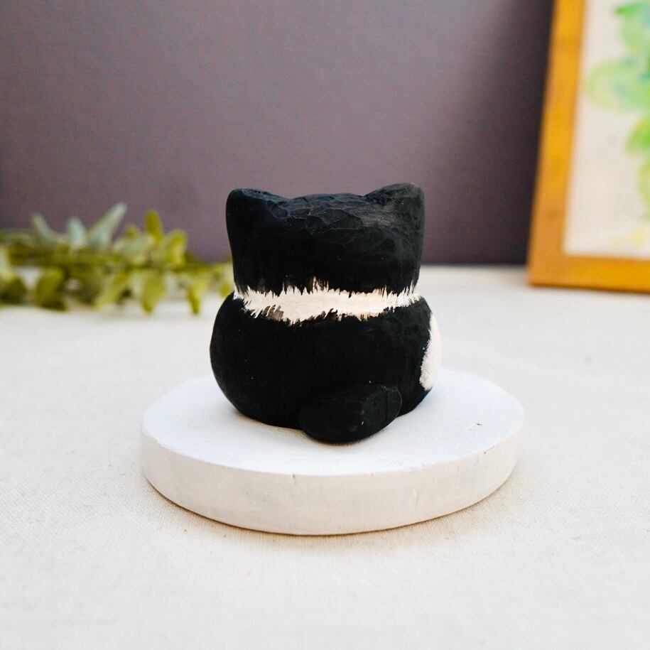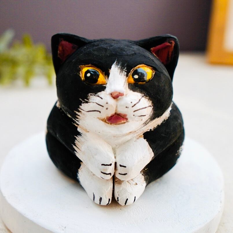 猫らしいポーズをとった木彫り猫は、手作業で彫られた顔も表情豊か。木の模様が出ていたり、触ると木の温かみも感じられます。