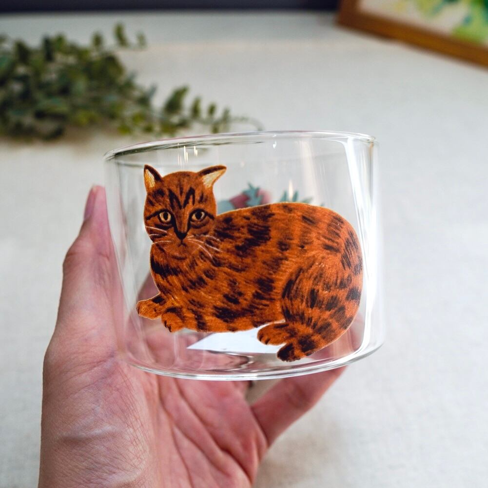 人気イラストレーター・松尾ミユキさんによる、愛らしい猫が描かれた耐熱グラス。