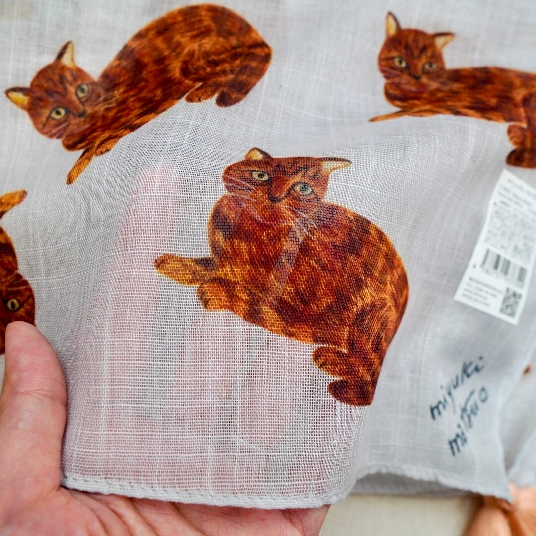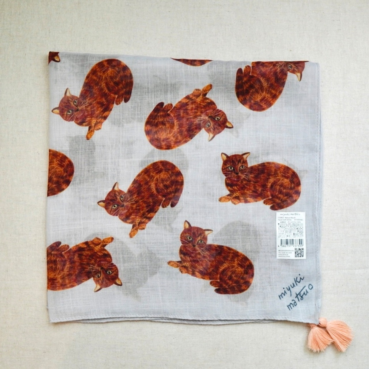 松尾ミユキさんデザインの、愛らしい猫が描かれたハンカチ。