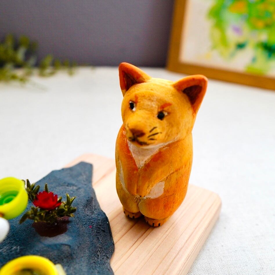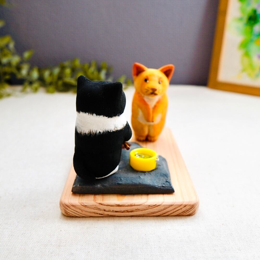 猫らしいポーズをとった木彫り猫は、手作業で彫られた顔も表情豊か。木の模様が出ていたり、触ると木の温かみも感じられます。
