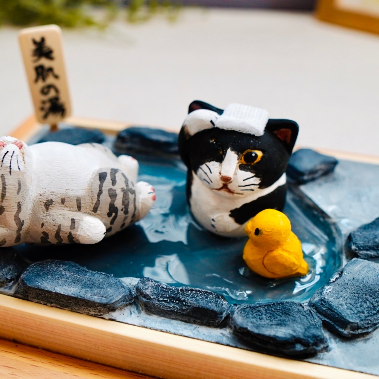 猫らしいポーズをとった木彫り猫は、手作業で彫られた顔も表情豊か。木の模様が出ていたり、触ると木の温かみも感じられます。