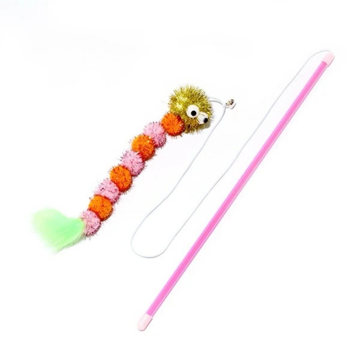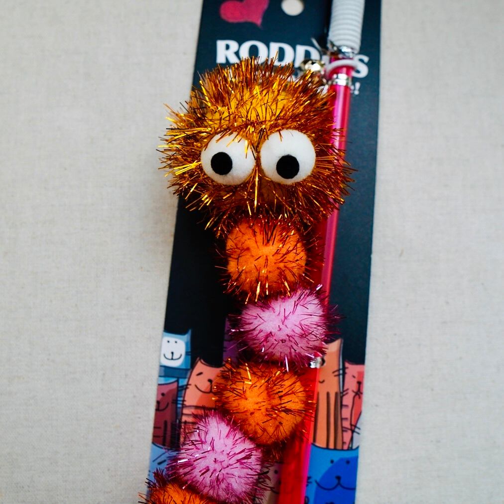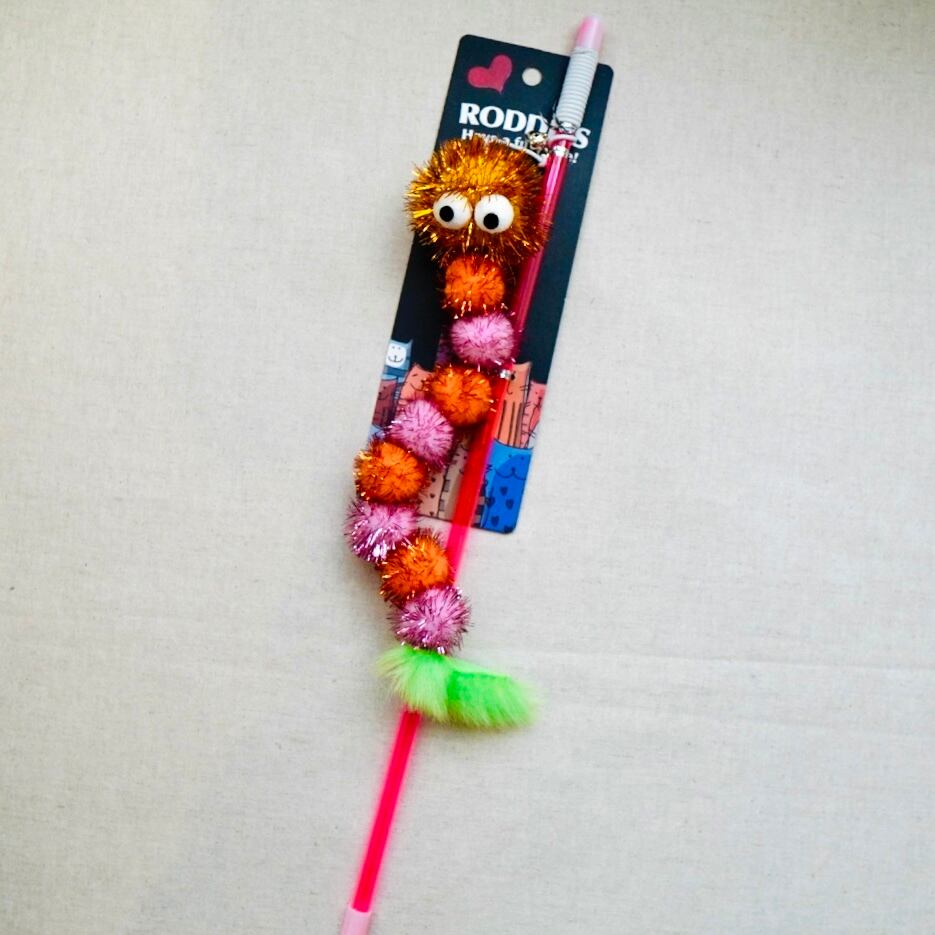 キラキラのモール付きポンポンでできたムシ型の猫じゃらしです。持ち手部分は、クリアカラーの筒状のロッド(棒)になっています。頭部近くには鈴、尻尾には毛足の長い生地を使っているので、音でも動きでも猫ちゃんを引きつけることができます。