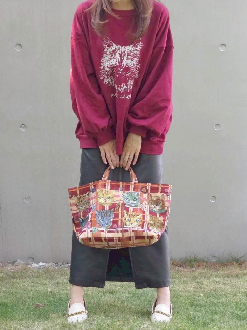フロントには印象的な猫の線画プリントがデザインされ、シンプルながらも存在感のある一枚。カジュアルながらも大人らしい落ち着きを感じさせるデザインです。