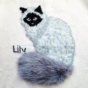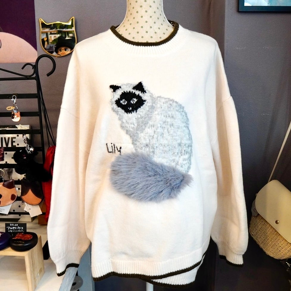 中央にはジャガード編みで表現された猫がデザインされ、ふわふわの立体的なしっぽが上品な遊び心をプラス。