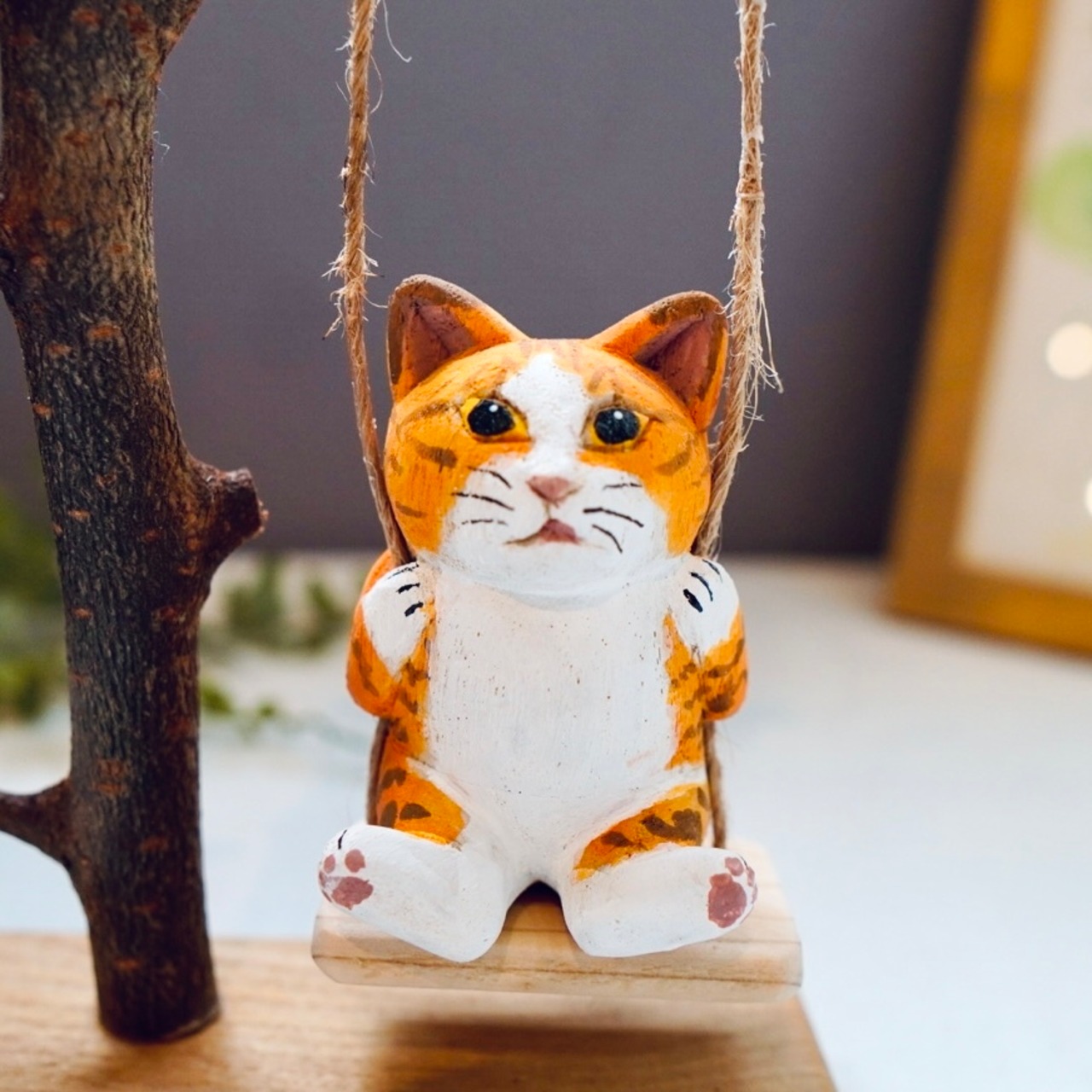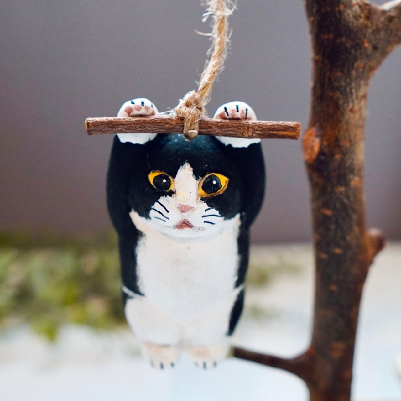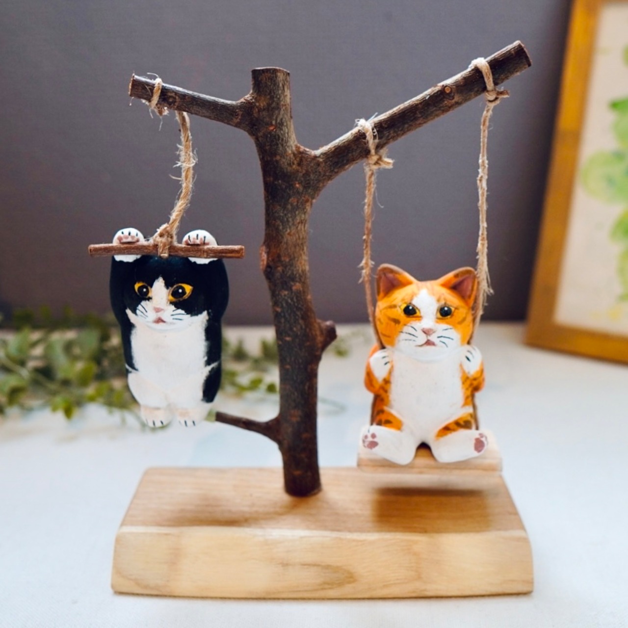 猫らしいポーズをとった木彫り猫は、手作業で彫られた顔も表情豊か。木の模様が出ていたり、触ると木の温かみも感じられます。