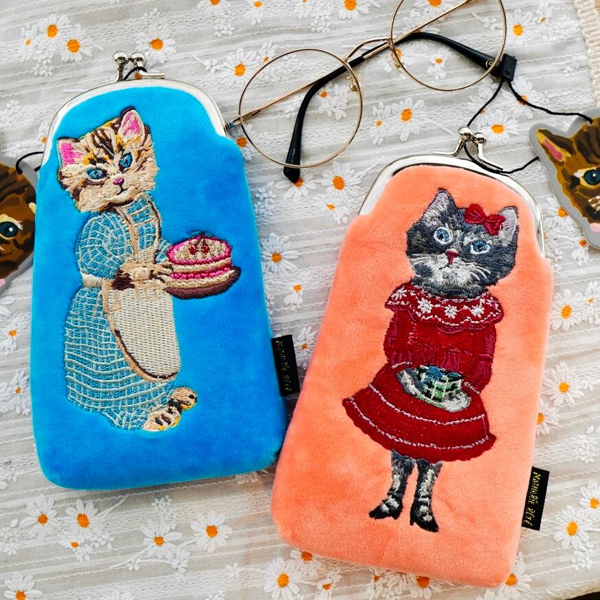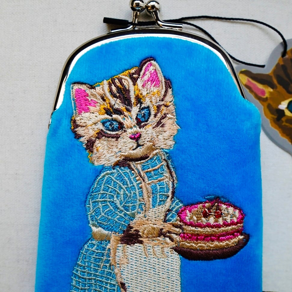 ふわふわのベルベット生地に猫の刺繍が施されたがま口ポーチ。
