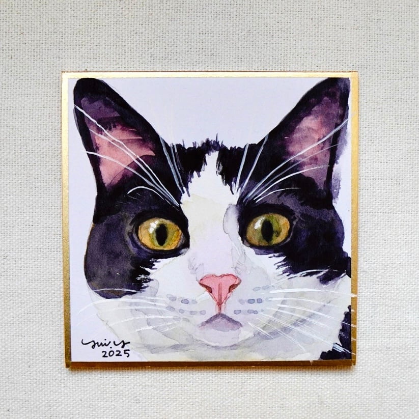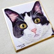 猫の絵 374 水彩画 原画 ミニ色紙 ハチワレ