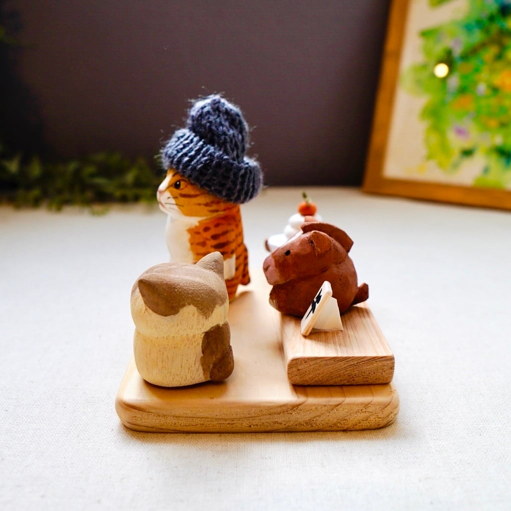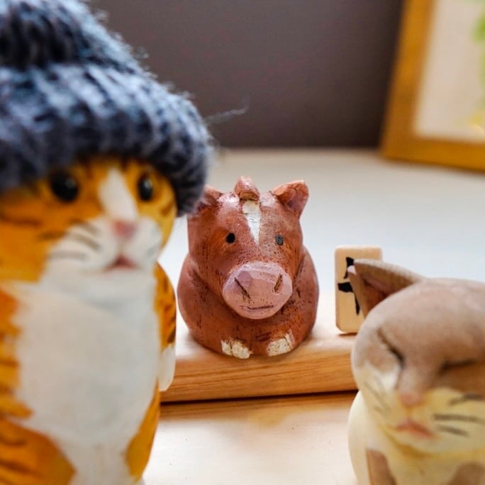 猫らしいポーズをとった木彫り猫は、手作業で彫られた顔も表情豊か。木の模様が出ていたり、触ると木の温かみも感じられます。