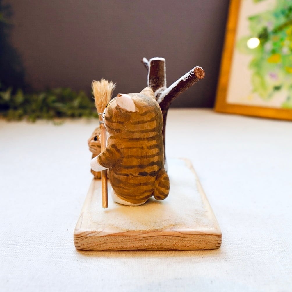 猫らしいポーズをとった木彫り猫は、手作業で彫られた顔も表情豊か。木の模様が出ていたり、触ると木の温かみも感じられます。