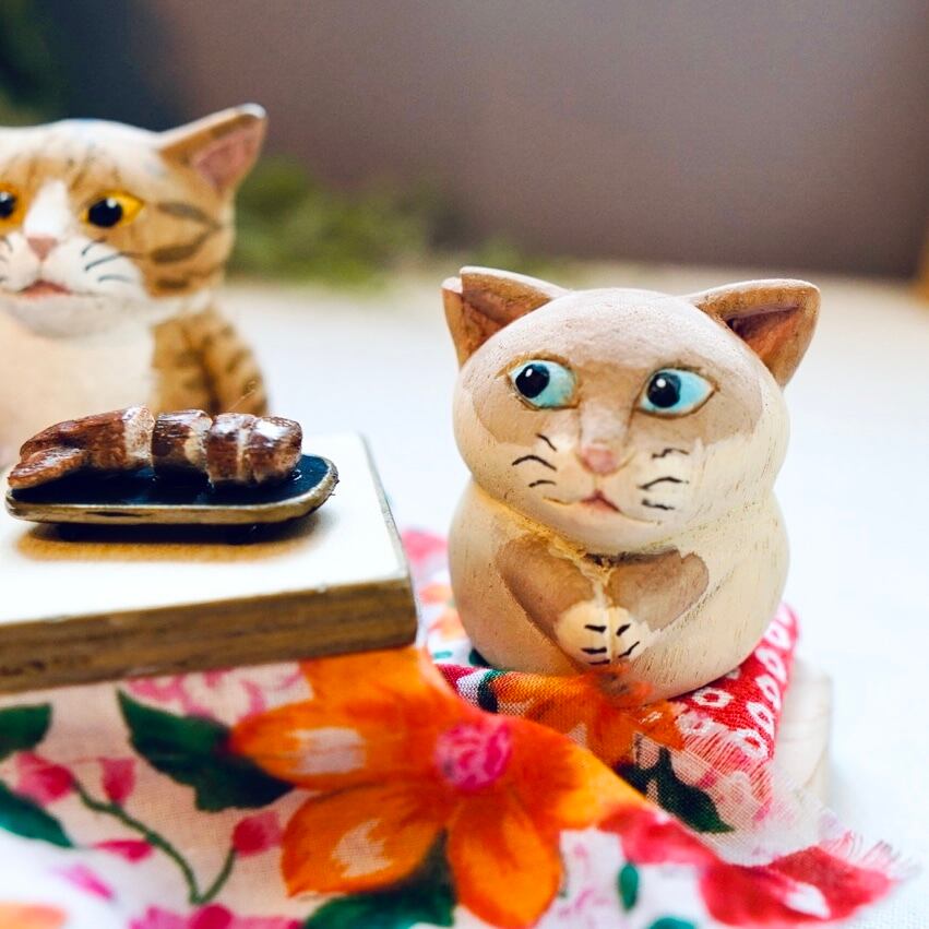 猫らしいポーズをとった木彫り猫は、手作業で彫られた顔も表情豊か。木の模様が出ていたり、触ると木の温かみも感じられます。
