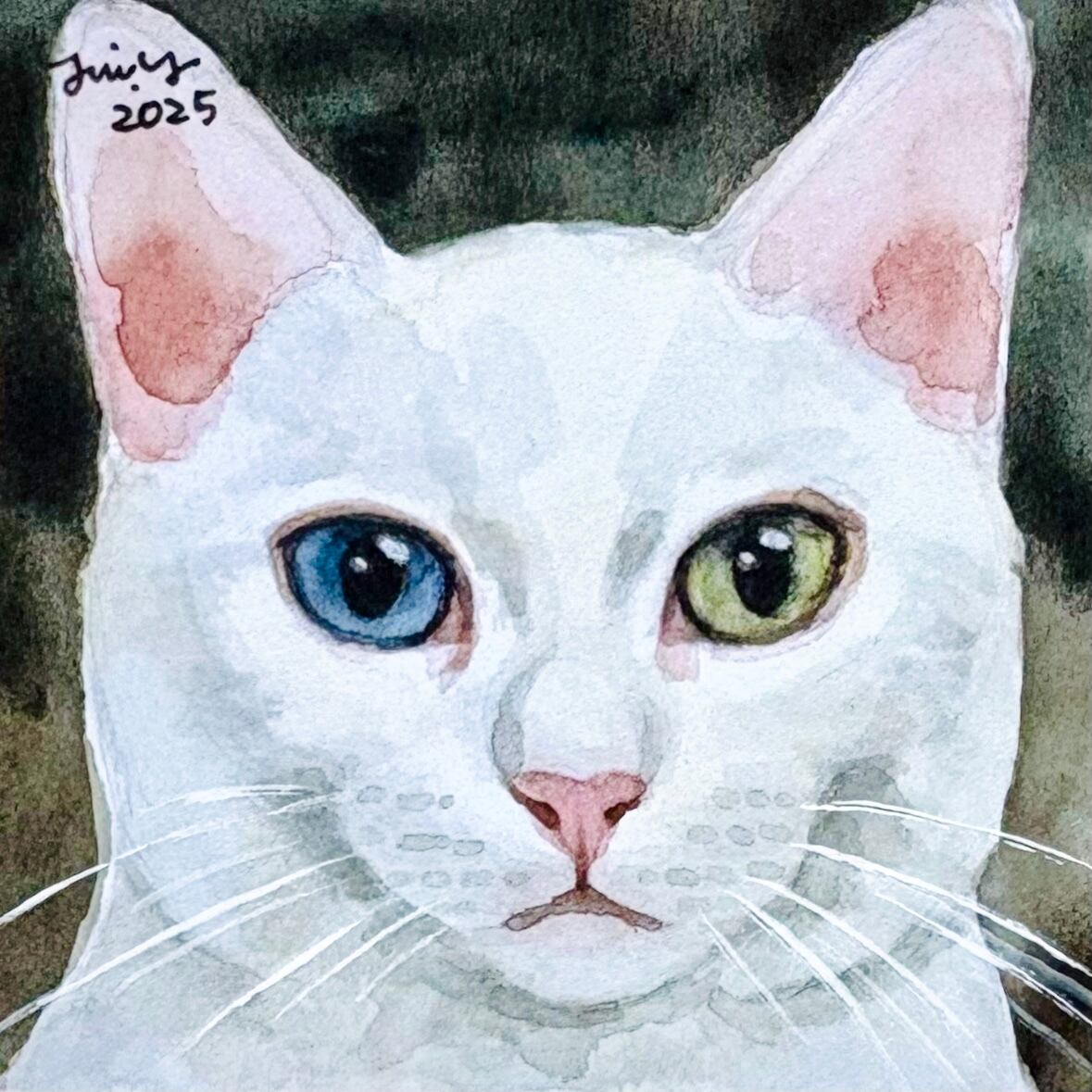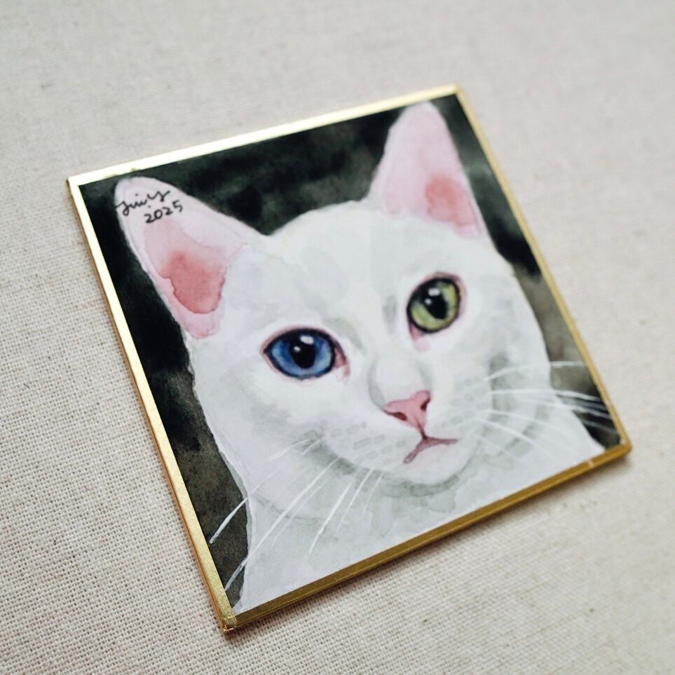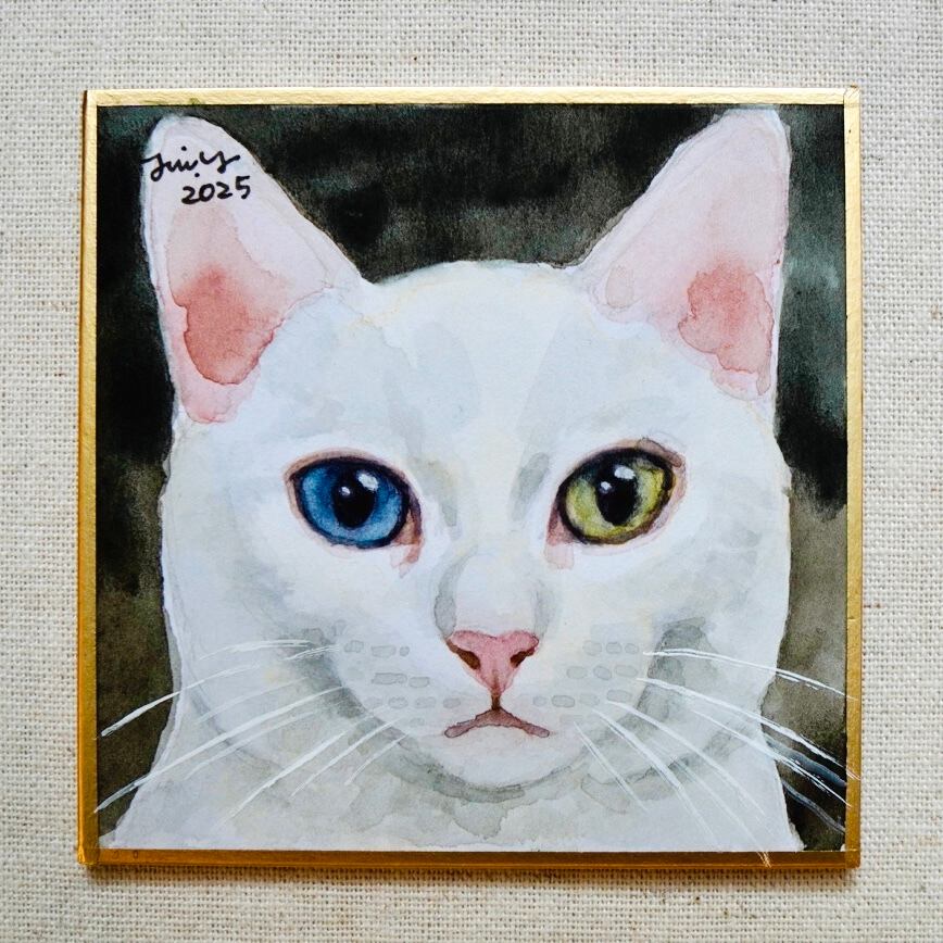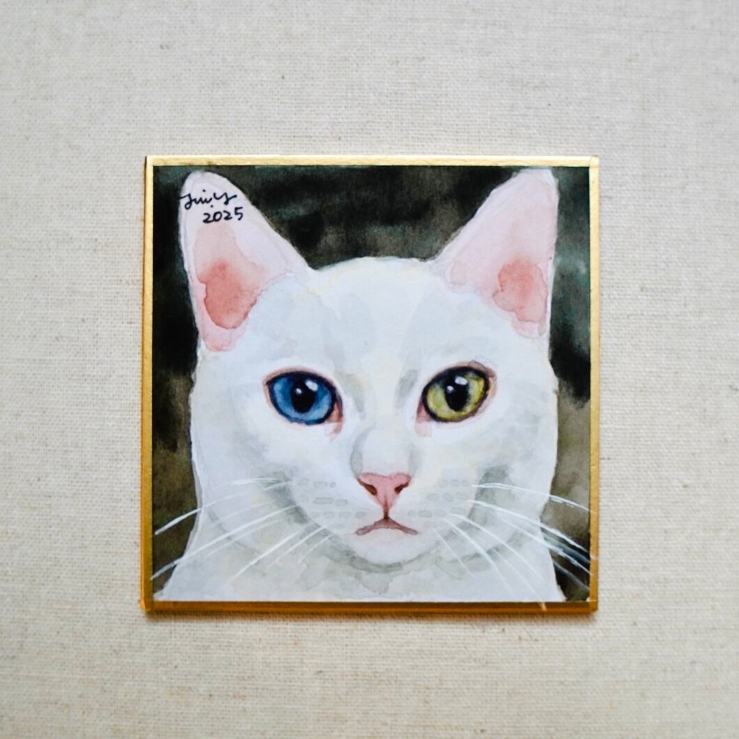 猫の絵 384 水彩画 原画 ミニ色紙 白猫