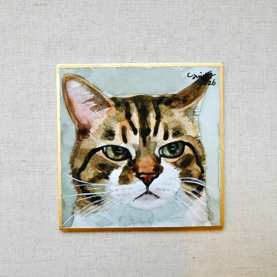猫の絵 395 水彩画 原画 ミニ色紙 キジ白猫