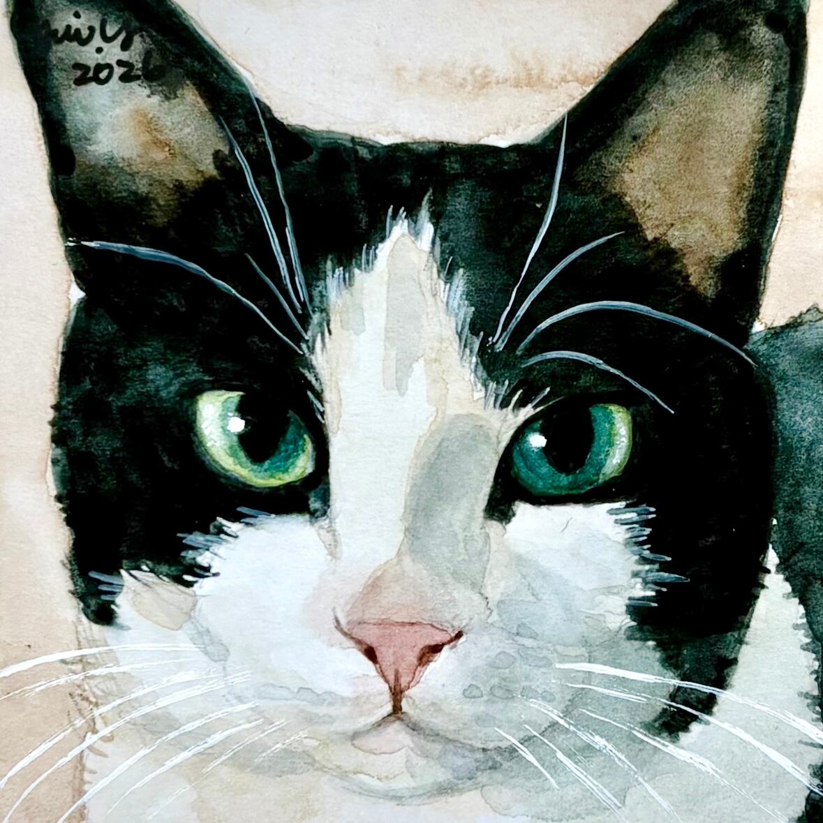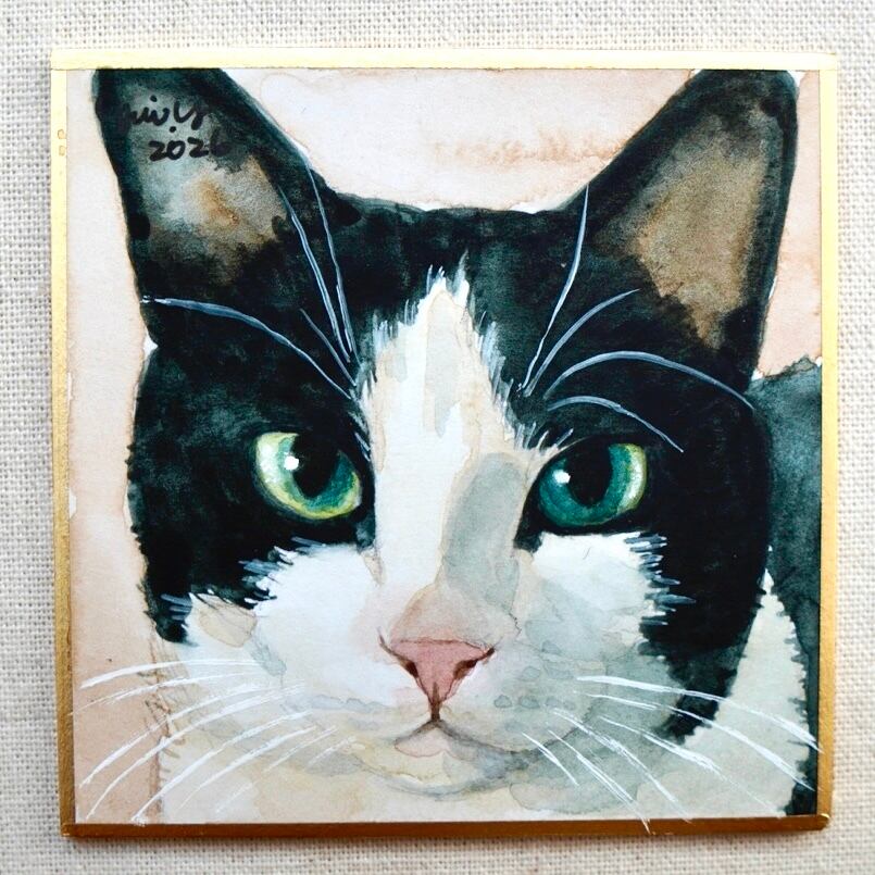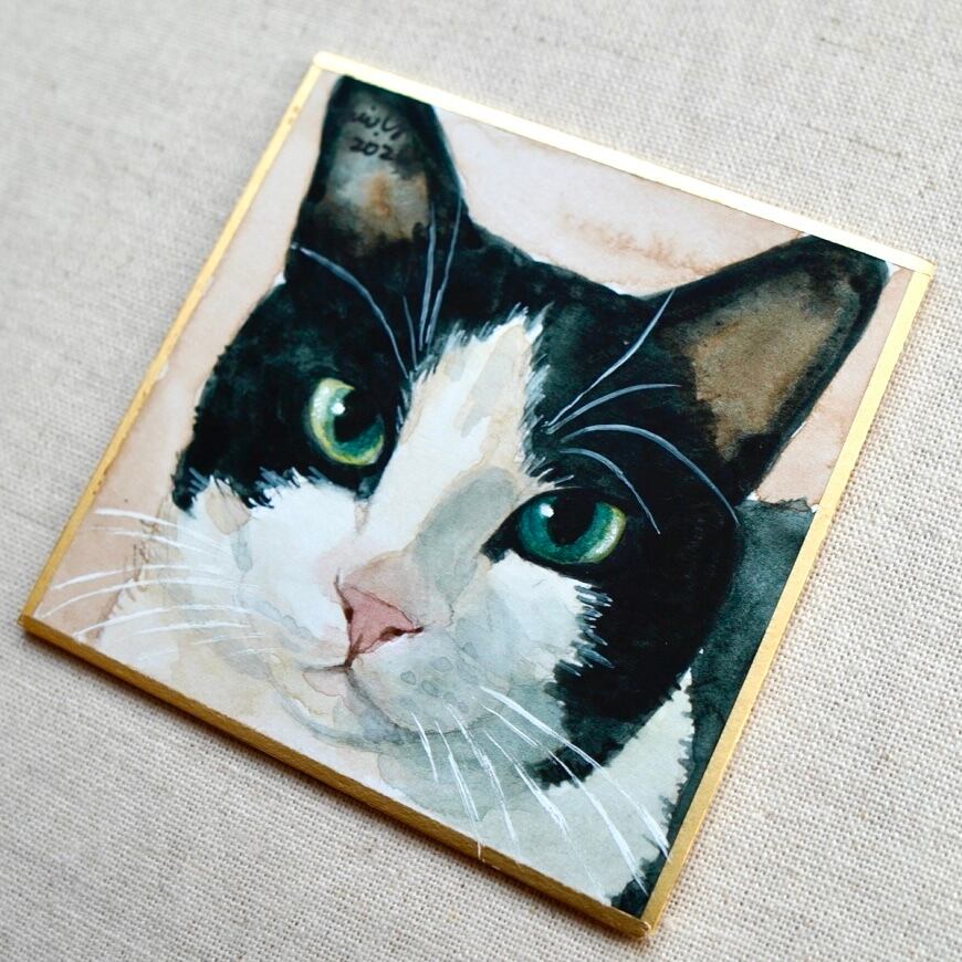 猫の絵 396 水彩画 原画 ミニ色紙 ハチワレ