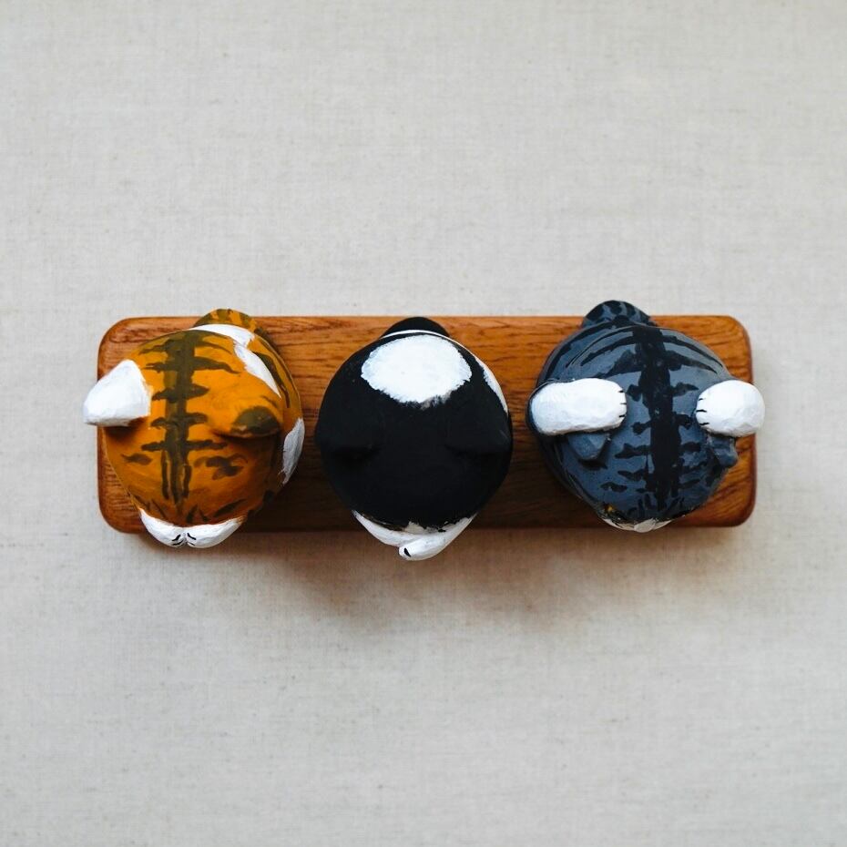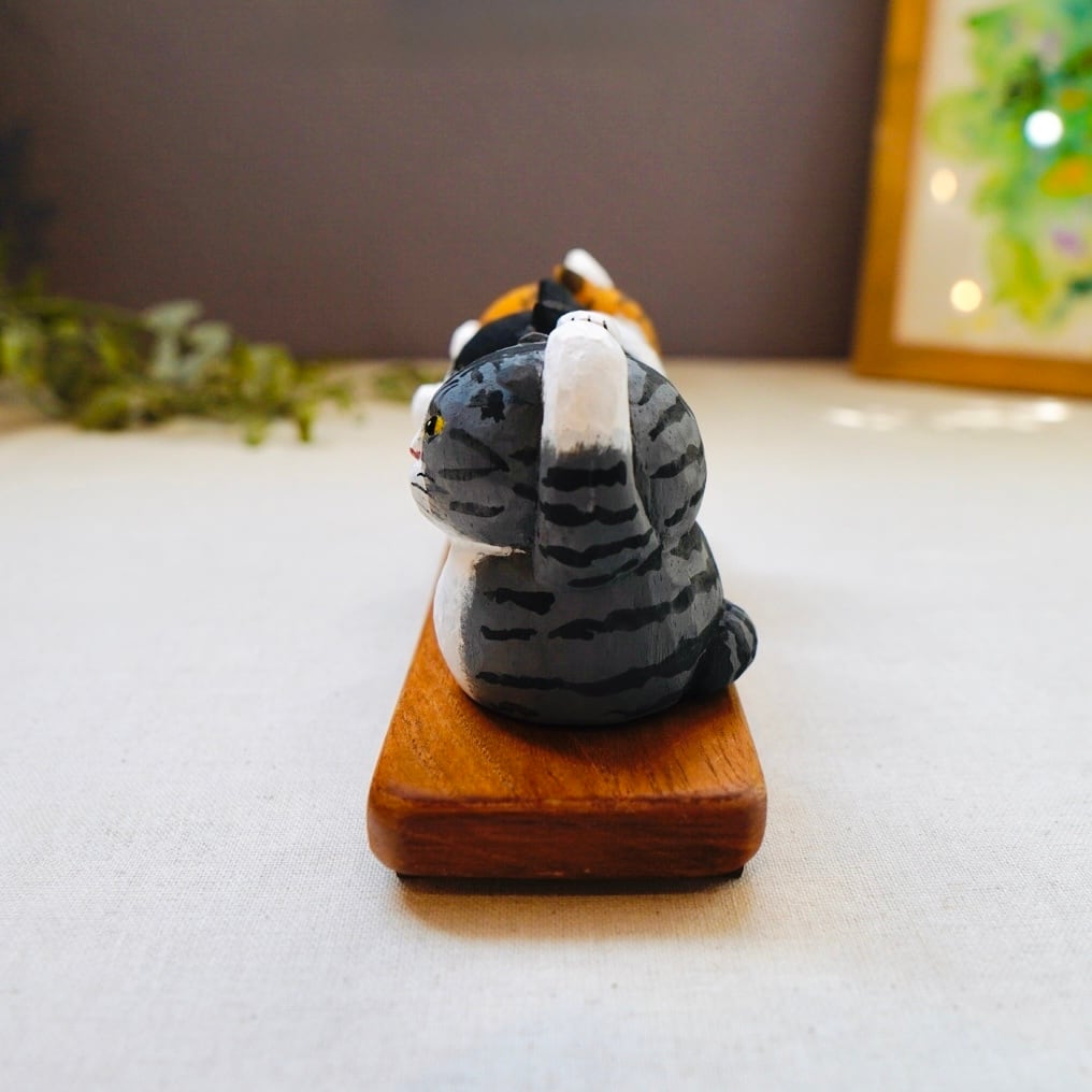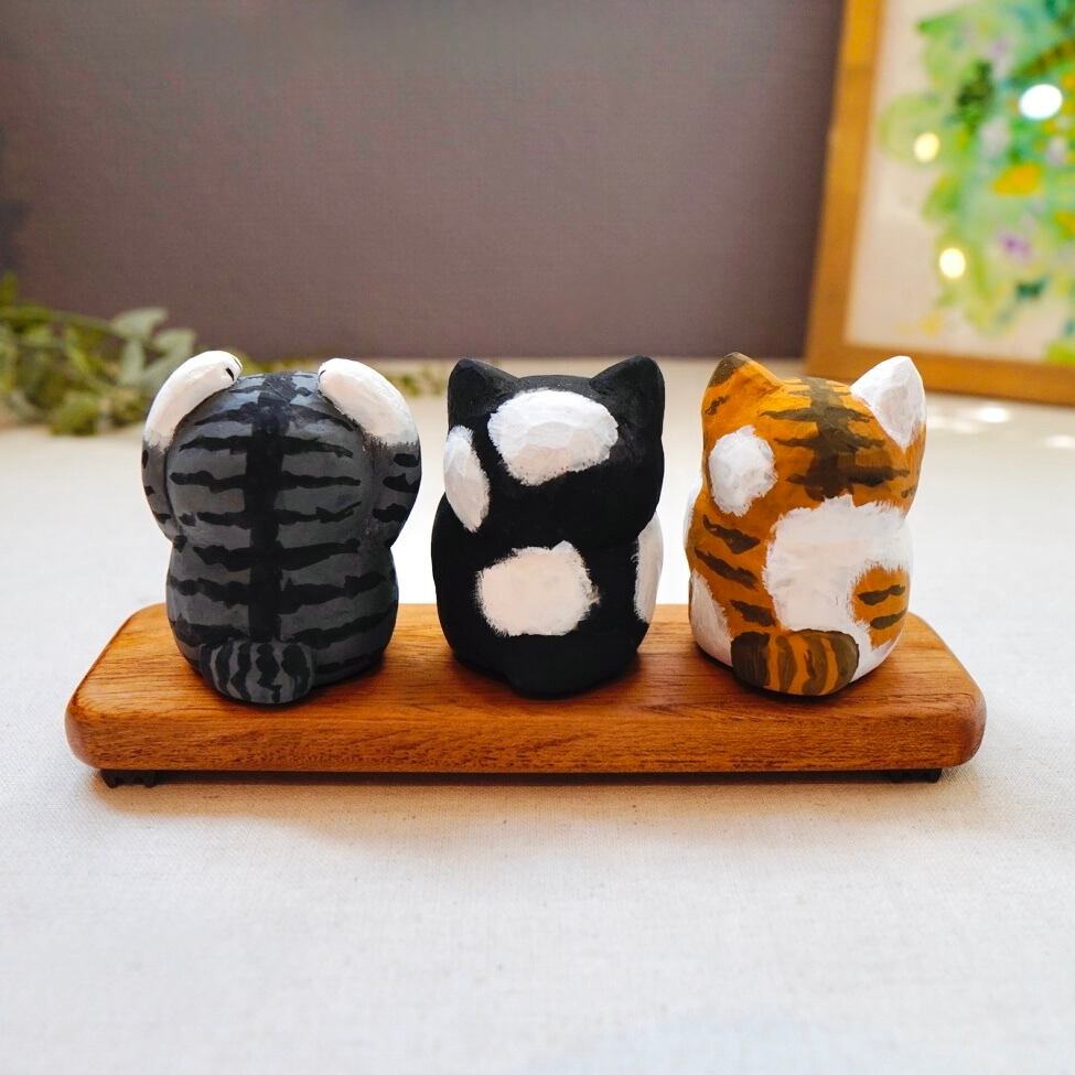 ひとつひとつ丁寧に彫られ、手作業で彩色された表情豊かな木彫り猫の置物です。