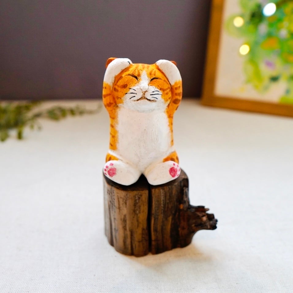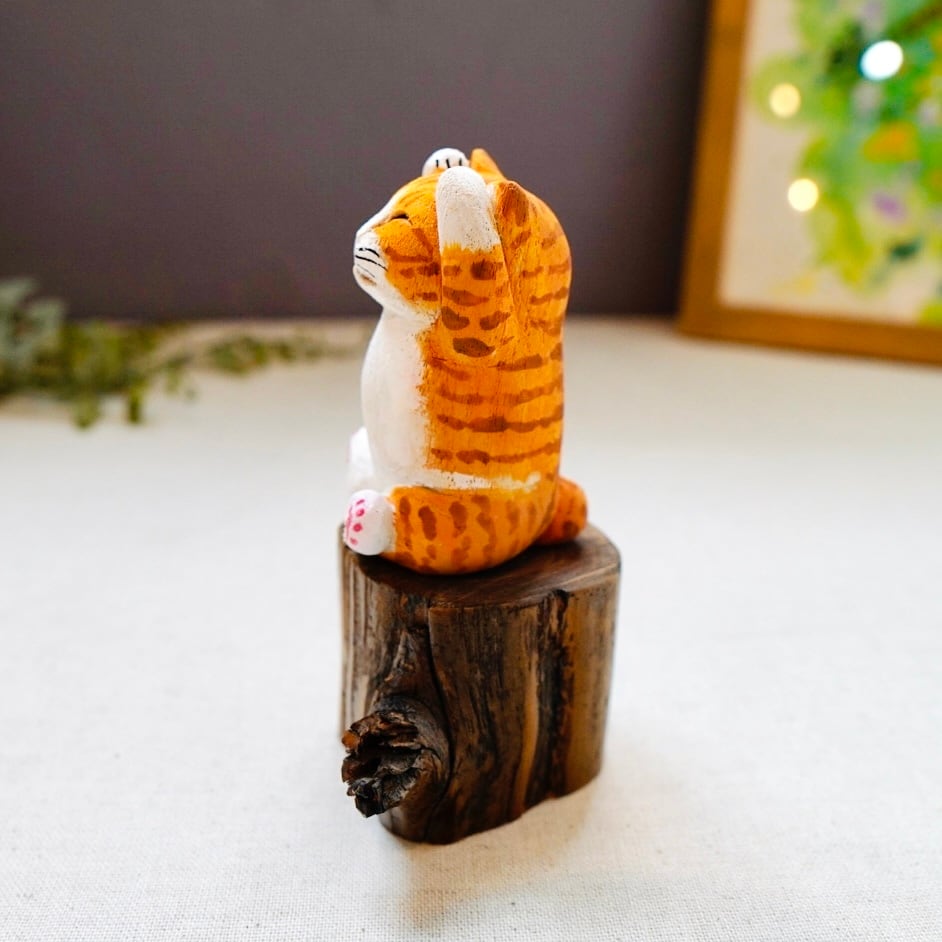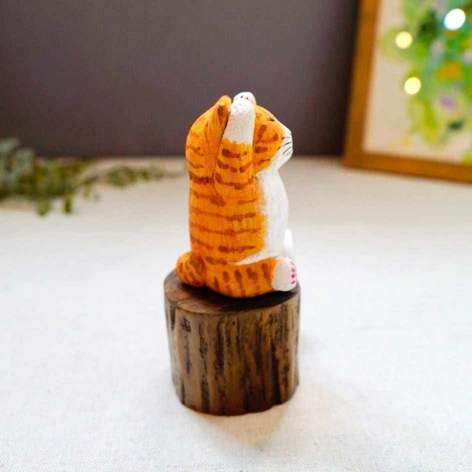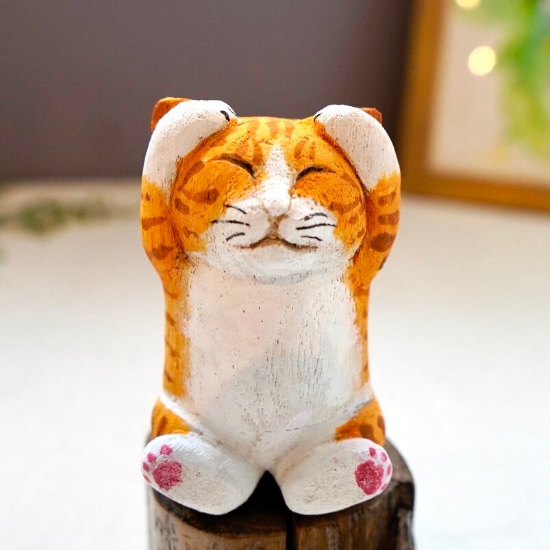 ひとつひとつ丁寧に彫られ、手作業で彩色された表情豊かな木彫り猫の置物です。