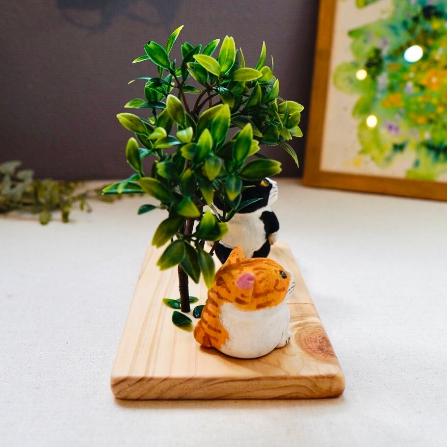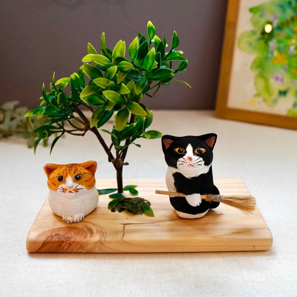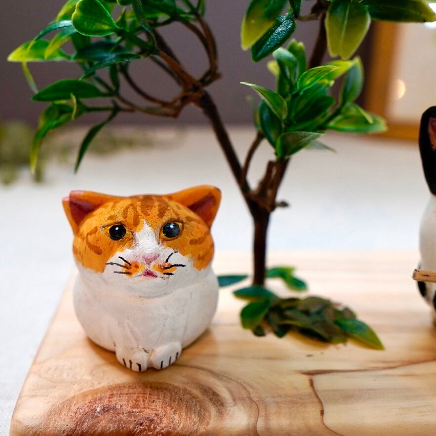 ひとつひとつ丁寧に彫られ、手作業で彩色された表情豊かな木彫り猫の置物です。