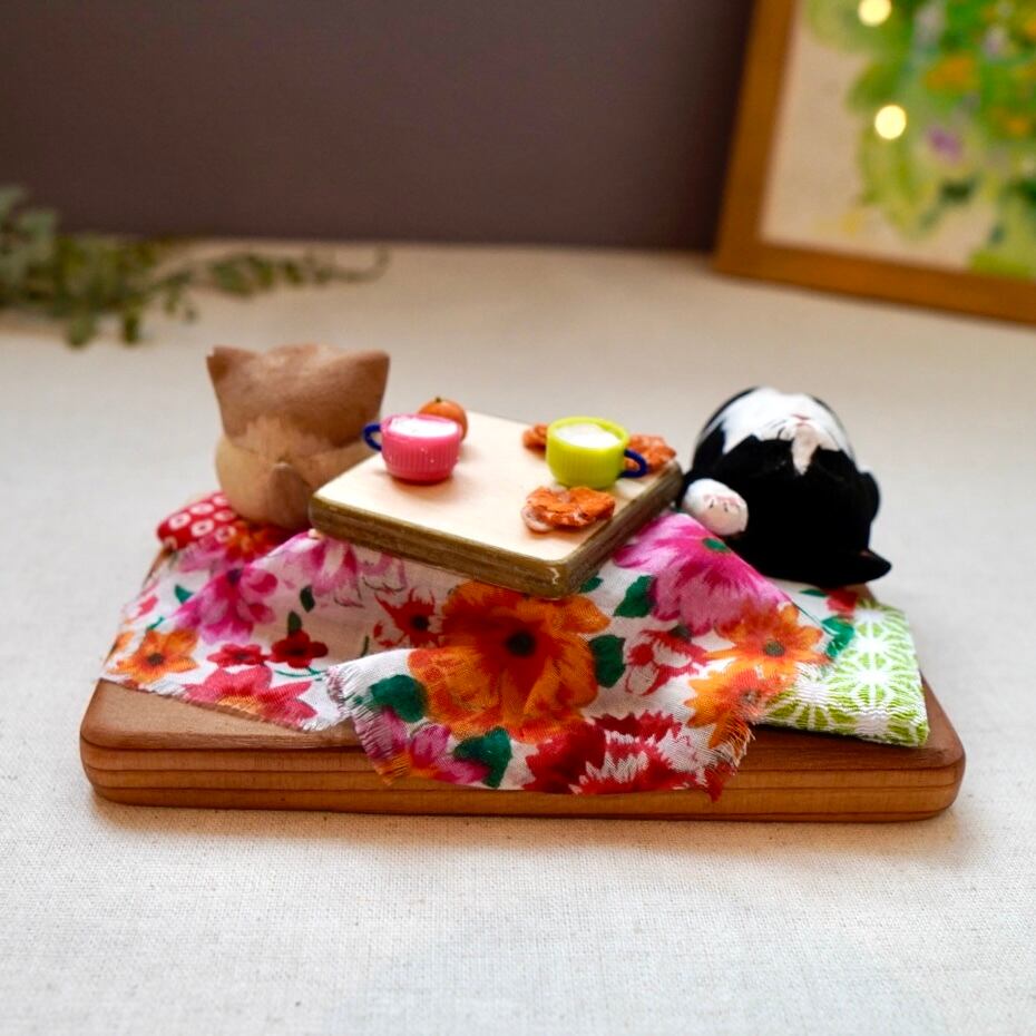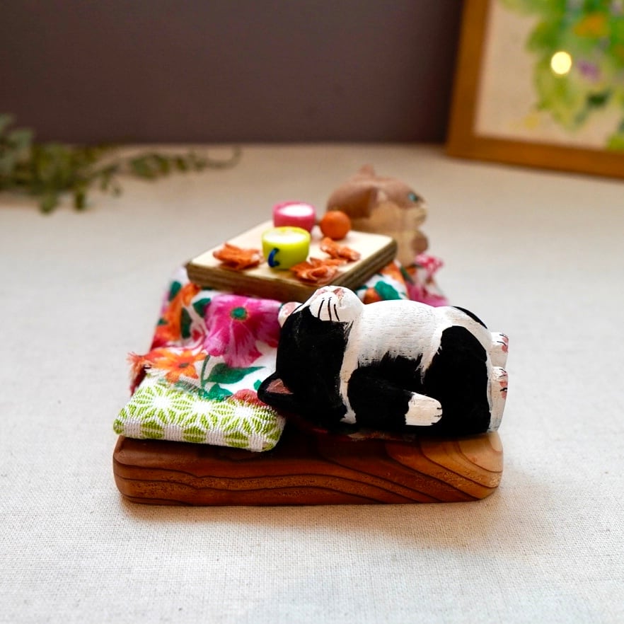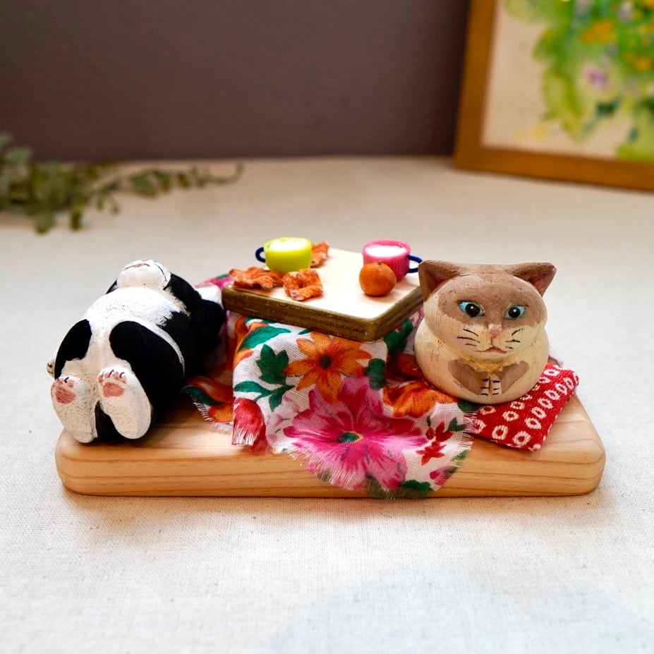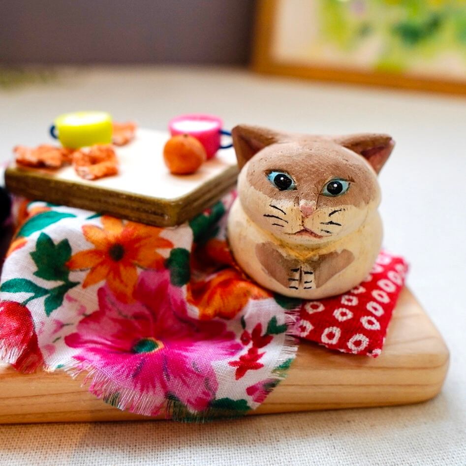 ひとつひとつ丁寧に彫られ、手作業で彩色された表情豊かな木彫り猫の置物です。