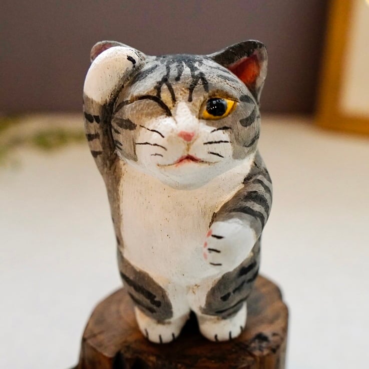 ひとつひとつ丁寧に彫られ、手作業で彩色された表情豊かな木彫り猫の置物です。