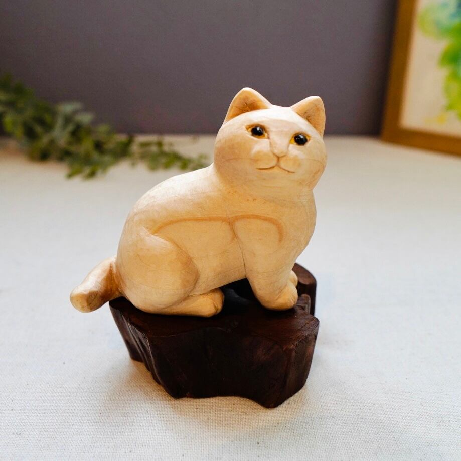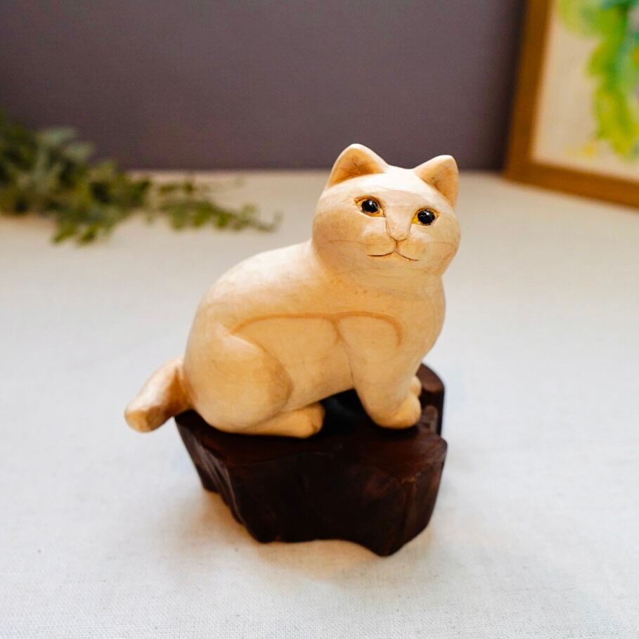 ひとつひとつ丁寧に彫られ、手作業で彩色された表情豊かな木彫り猫の置物です。