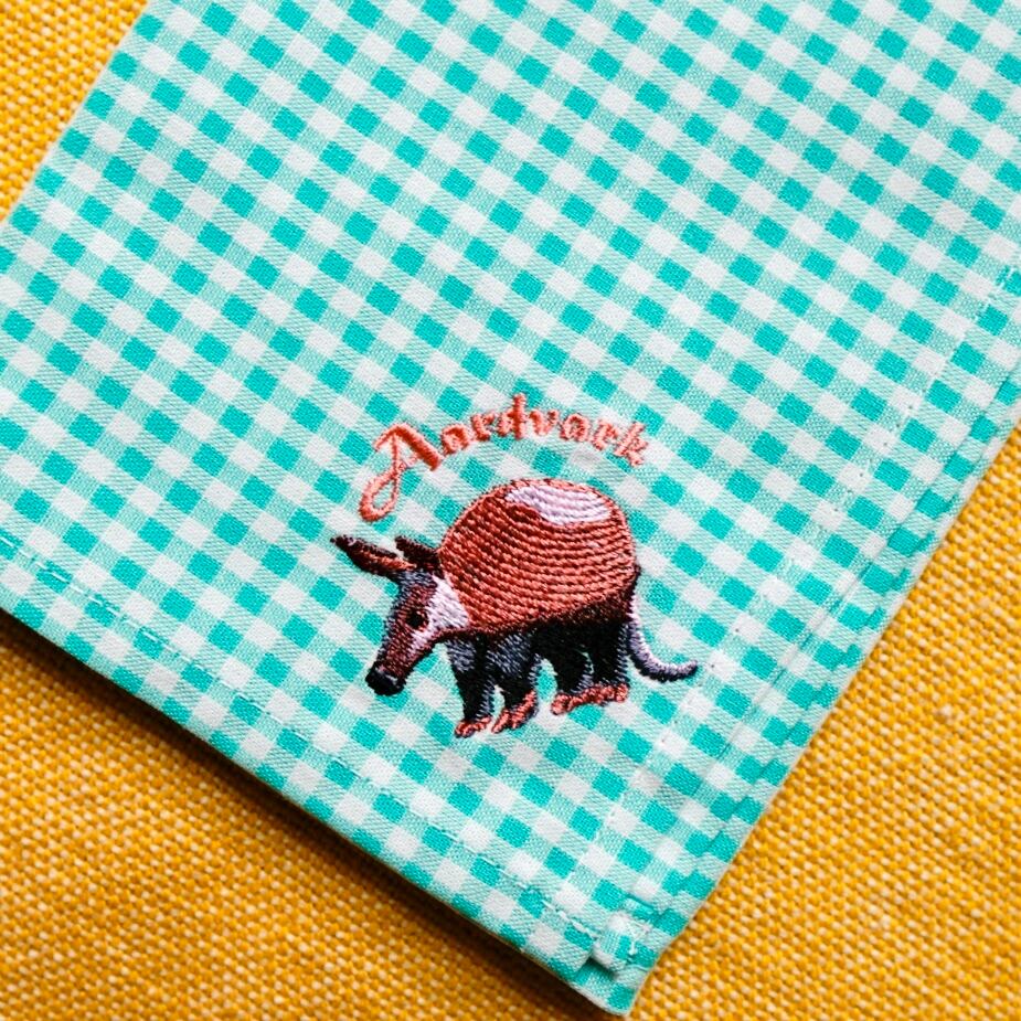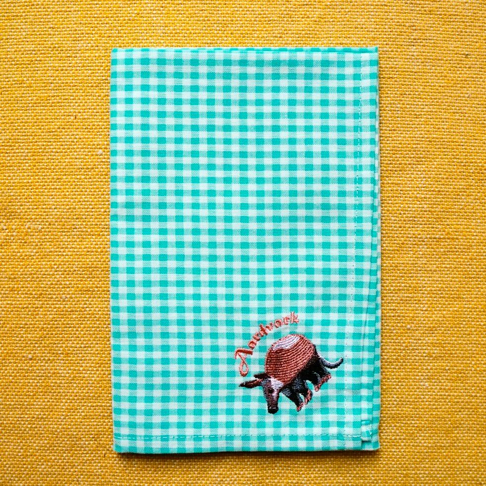 ギンガムチェックが可愛い♪珍獣たちが細やかな刺繍で表現されたハンカチです。ランチクロスとしても使えます。プレゼントにもおすすめ!