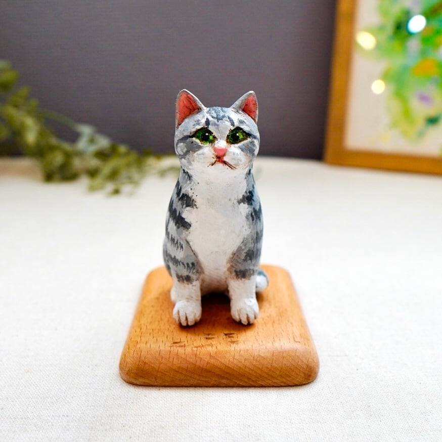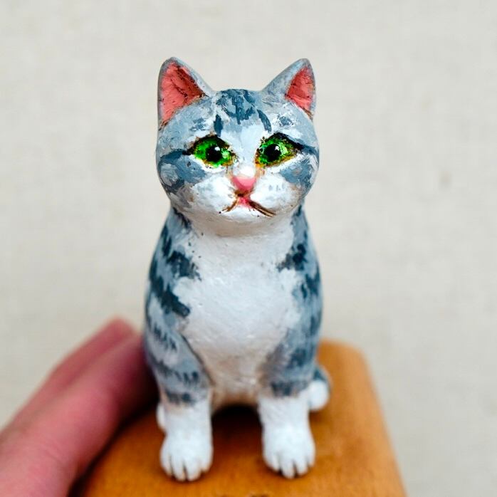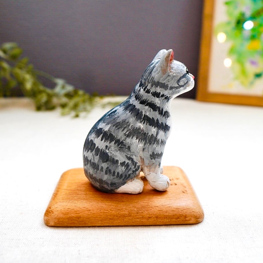 猫らしいポーズをとった木彫り猫は、手作業で彫られた顔も表情豊か。木の模様が出ていたり、触ると木の温かみも感じられます。