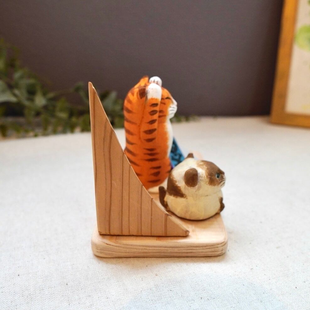 猫らしいポーズをとった木彫り猫は、手作業で彫られた顔も表情豊か。木の模様が出ていたり、触ると木の温かみも感じられます。